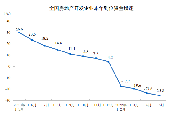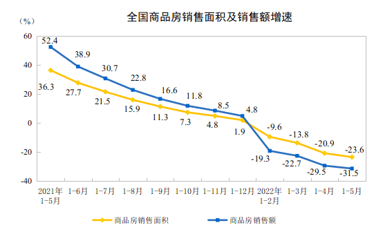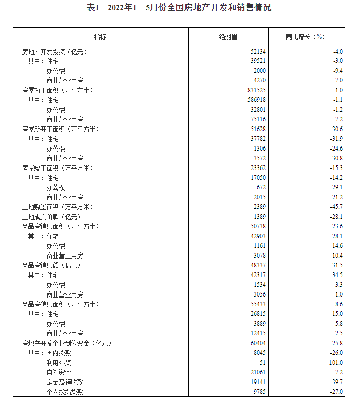 6月15日,国家统计局数据显示,2022年1-5月份全国商品房销售额48337亿元,下降31.5%;其中,住宅销售额下降34.5%。商品房销售面积50738万平方米,同比下降23.6%;其中,住宅销售面积下降28.1%。1-5月份,个人按揭贷款9785亿元,下降27.0%。