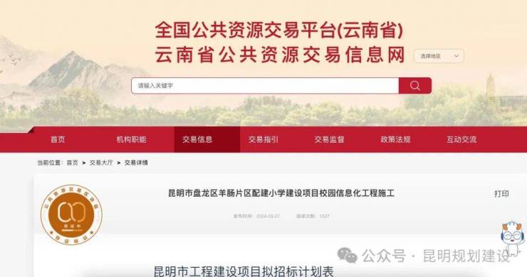 3月27日,云南省公共资源交易信息网发布了“昆明市盘龙区羊肠片区配建小学建设项目校园信息化工程施工”拟招标计划表。根据拟招标计划,该项目位于盘龙区羊肠大村,南临盘龙128号路,东临通源路,西临盘龙7号路,北临盘龙5号路。