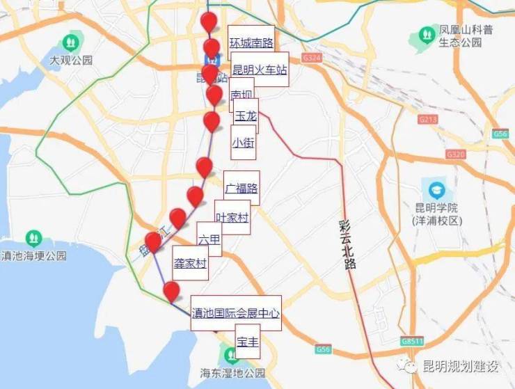 昆明火车站 — 南坝站 — 玉龙站 — 小街站 — 广福路站 — 叶家村站 — 六甲站 — 龚家村站 — 滇池国际会展中心站 — 宝丰站 — 海东公园站