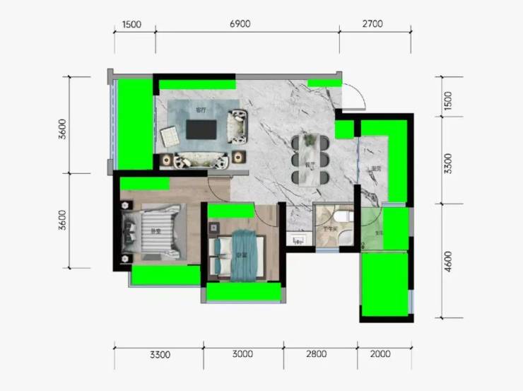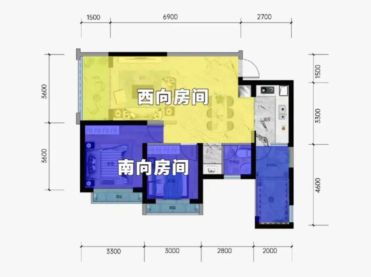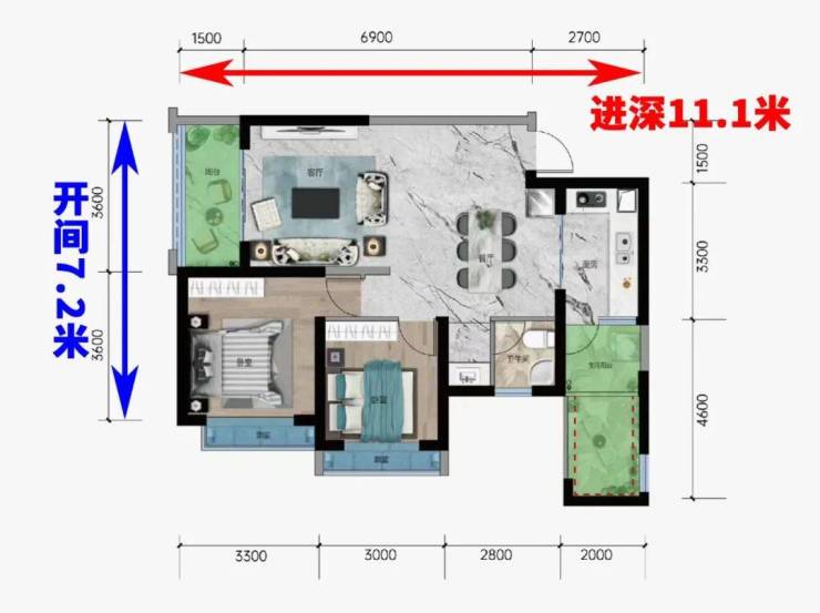 客厅开间3.6米,属于竖厅,属于在市场上比较常见的尺度。