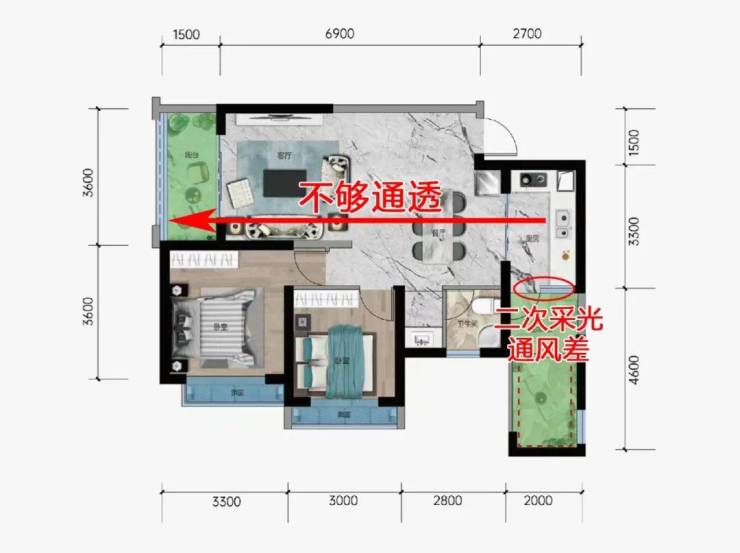 厨房只能通过生活阳台进行二次采光,因此生活阳台难免有油烟,且阳台面积还不小,难以扩散出去,也无法和客厅的景观阳台形成空气对流,导致整个房间不够通透。