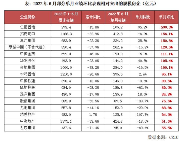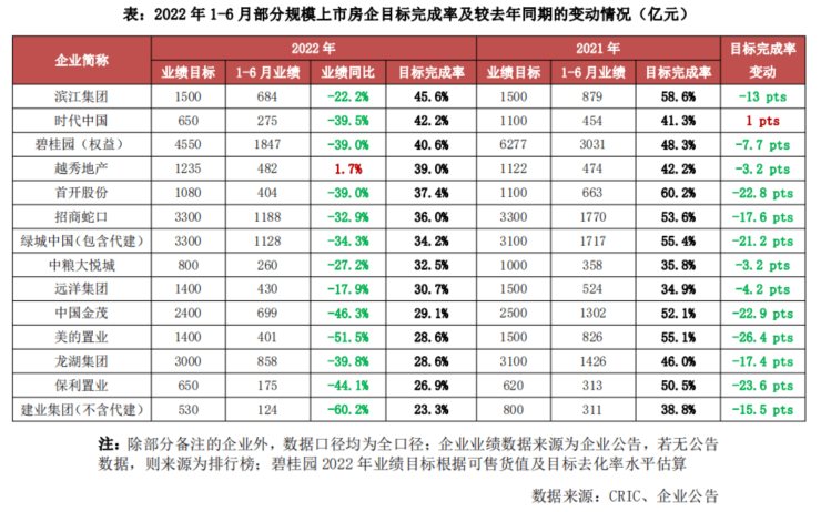 克而瑞在报告中表示,6月份,部分规模房企项目去化情况较佳、单月业绩表现突出,如中海、华润、绿城、招商、金地、绿地、滨江、金茂、越秀、华发、仁恒等企业单月业绩环比增幅均在60%以上。从规模房企上半年业绩目标的完成情况来看,在公开披露年度目标的规模上市房企中,多数企业截至6月末的目标完成率不足40%,有近半数企业甚至不足30%。绝大多数企业上半年的目标完成度均大幅低于2021年同期,部分企业目标完成度较2021年同期的降幅大于20个百分点。
