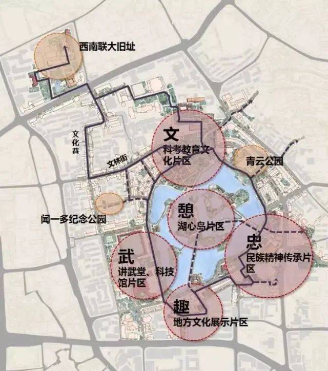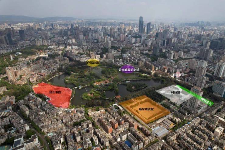 五大片区主要为:一堂两馆(讲武堂、洗马河历史景观、科技馆)文化主题片区、地方文化展示主题片区(石屏会馆、基督教堂、沈官坡、景虹街)、民族精神传承片区(黄公祠、卢汉公馆、文保单位登华街、朱德旧居等多处)、科考教育文化主题片区、湖心岛片区。
