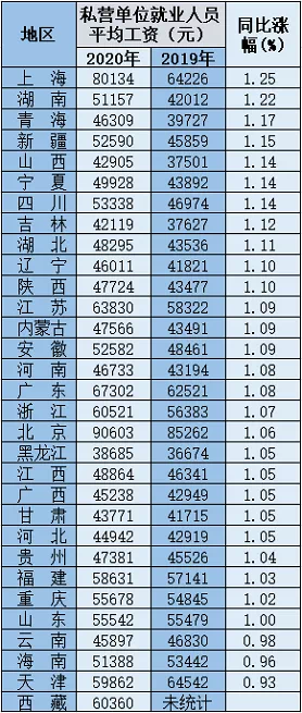 从平均工资来看,非私营单位中,北京、上海、西藏、天津、浙江、广东、江苏、青海八个地区超过10万元,排名靠前;私营单位中,北京、上海、广东、江苏、浙江、西藏六个地区均超过6万元,排名靠前。