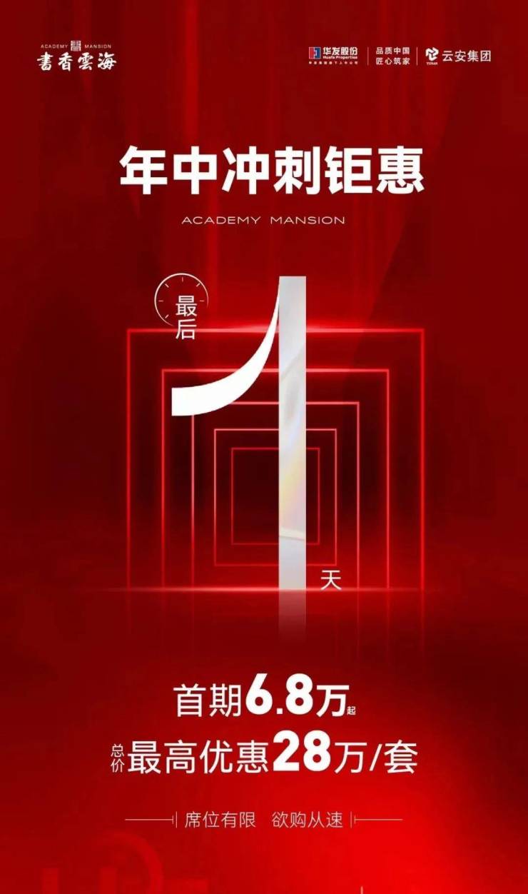 书香云海也发了年中冲刺优惠最后1天,首期6.8万起,总价较高优惠28万/套的海报。