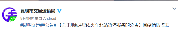 3月13日,昆明市交运局发布公告,因疫情防控需要自2022年3月14日起,昆明地铁4号线火车北站暂停服务。