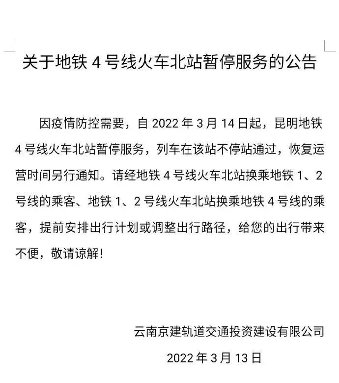 因疫情防控需要,自2022年3月14日起,昆明地铁4号线火车北站暂停服务,列车在该站不停站通过,恢复运营时间另行通知。请经地铁4号线火车北站换乘地铁1、2号线的乘客、地铁1、2号线火车北站换乘地铁4号线的乘客,提前安排出行计划或调整出行路径,给您的出行带来不便,敬请谅解!