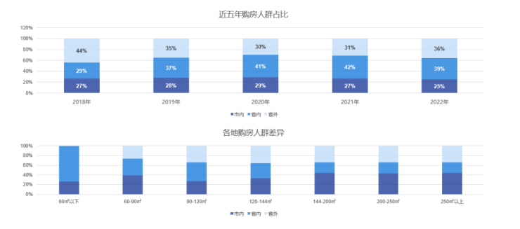 疫情三年主力购房人群从疫情前的外省置业人群,转变为地州来昆工作或学习的家庭,昆明本地人购房需求小幅收缩;从2022年购房人群的需求偏好透视数据来看,本地人群购房偏向改善性,地州客群购房刚需为主,省外客户购房偏好较均衡(详见下图)。