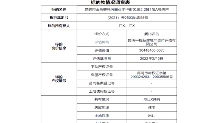 这次司法拍卖标的物情况调查表也表明,桥香园这两处房产的标的所有权人确实都有两位,产权证也是两人共有。其中,金马碧鸡店仅涉及一层,800多平方米,一本产权证;小西门店总体面积稍小,但涉及多层,多本产权证,情况相对复杂。