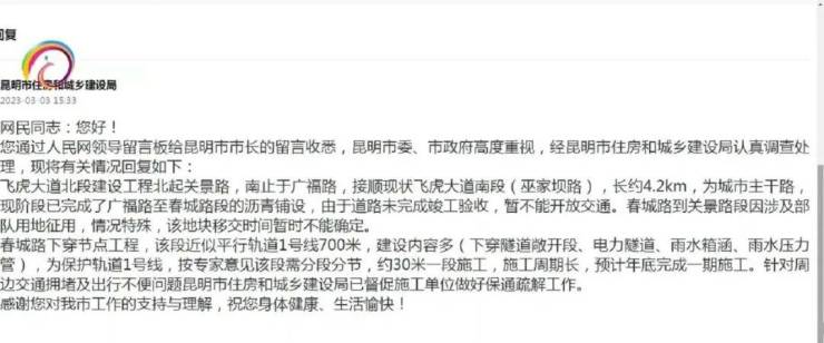 这位市民在留言中说,飞虎大道北段原定于今年一月部分通车,但现在仍在施工,没有通车消息,并且春城路隧道也没有通车消息。这两条道路无法通车,导致巫家坝片区的市民出行十分不便,他想了解这两条道路最新的通车时间。