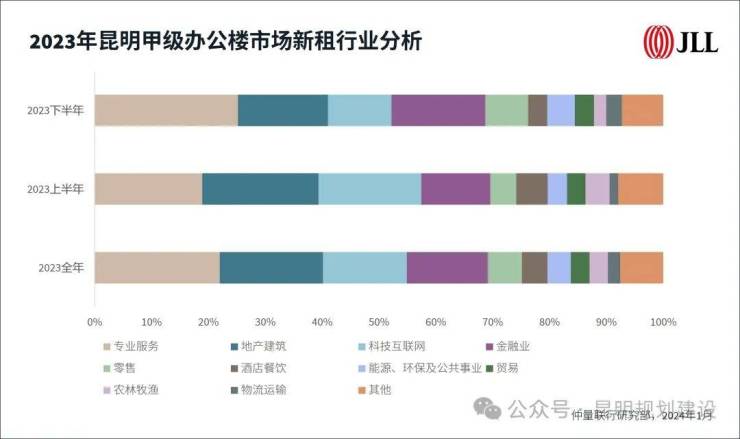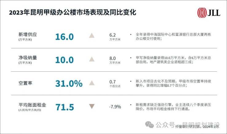 仲量联行指出,由于部分商业地产项目缓建,昆明未来四年甲级办公楼新增供应共计约33万平方米,“去库存”将主导市场发展,预计到2027年空置率有望回落至30%以下。