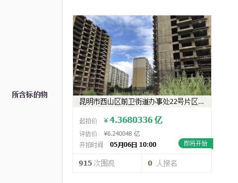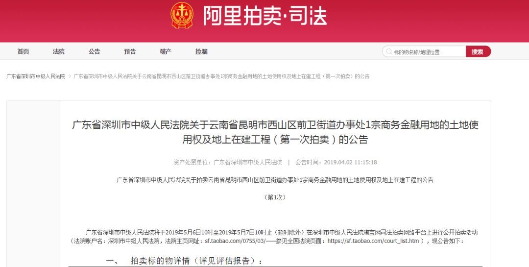 近日,广东省深圳市中级人民法院发布拍卖公告:深圳市中级人民法院淘宝网司法拍卖网络平台将于5月6日进行公开拍卖活动,拟司法拍卖“昆明市西山区前卫街道办事处2宗土地使用权及地上在建工程”。