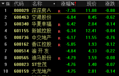 10月9日早间,A股三大指数弱势下跌,其中房地产开发板跌幅靠前。截至午间收盘,A股房地产板块跌幅为2.44%,其中深深房A、华夏幸福、新城控股、中交地产跌超过6%;香江控股、渝开发、迪马股份、ST世茂、南国置业跌超4%;云南城投、金融街、中南建设、信达地产、珠江股份、华远地产跌幅超3%。