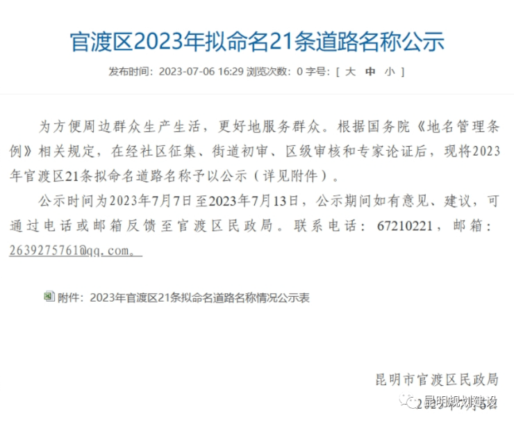 为方便周边群众生产生活,更好地服务群众。根据国务院《地名管理条例》相关规定,在经社区征集、街道初审、区级审核和专家论证后,现将2023年官渡区21条拟命名道路名称予以公示。