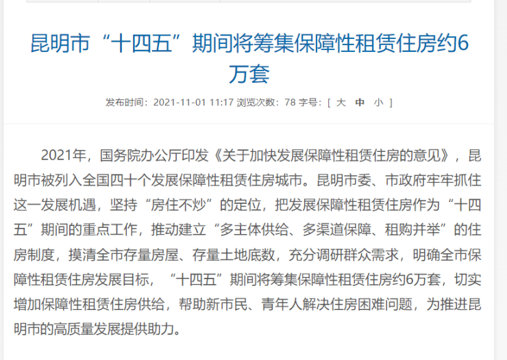 据昆明市住房和城乡建设局公布信息,作为全国40个发展保障性租赁住房的城市之一,“十四五”期间,昆明积极响应国家政策,计划筹集保障性租赁住房约6万套,切实增加保障性租赁住房供给,帮助新市民、青年人解决“住房难”问题,为推进昆明市的高质量发展助力。
