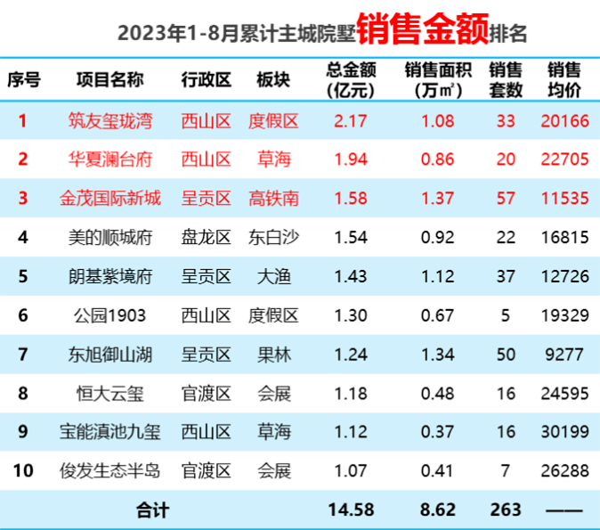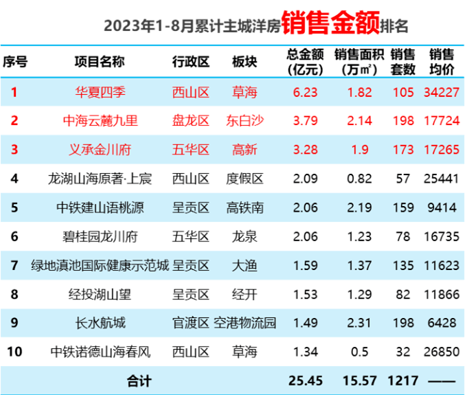 昆明房协发布了1-8月主城高层、洋房、院墅排名前十的项目销售金额,我们一起来看看过去的8个月里,哪些项目跑量成功。