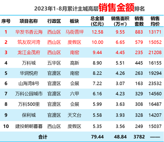 从销售金额上来看,1-8月,高层项目中依旧是华发书香云海、筑友双河湾、龙江金茂府三个项目。