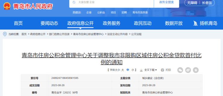 8月28日,青岛市住房公积金管理中心发布《关于调整青岛市非限购区域住房公积金贷款首付比例的通知》。