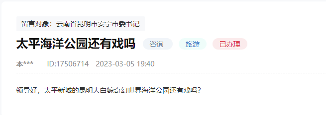 日前,有网友在人民网-领导留言板询问,太平大白鲸奇幻世界海洋公园还有戏吗?3月23日,安宁市太平新城街道对网友进行了回复。