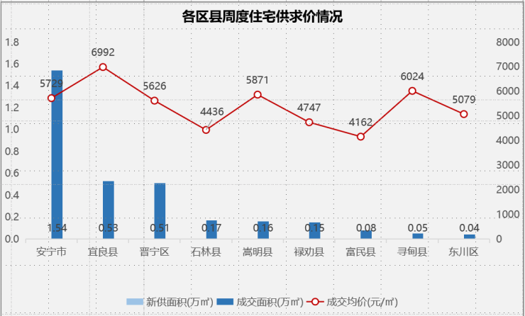 热点郊县:安宁主城成交量有所回落,创佳城二期影响均价有所波动 ;太平吾悦海悦西山等以价换量项目阶段性集中备案,量升价跌;晋宁受麟昊小区集中备案影响,量升价跌 ;嵩明成交量下降,均价小幅波动。