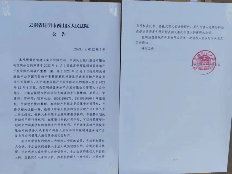 11月10日,通盈公司管理人发布了《关于阳光城滇池半山商品房消费者权利保护的告知》和《关于履行剩余价款支付义务的催告》,分别对支付完购房款和未支付完购房款的业主进行了房屋交付请求、缴款等说明,并表示将全力做好保交付工作。