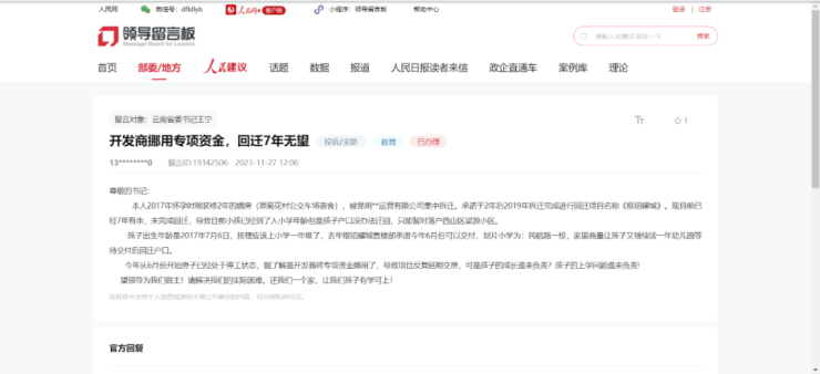 另外,有网友反映,刚装修2年的婚房(原菊花村公交车场宿舍)于2017年被集中拆迁,原本承诺于2年后也就是2019年拆迁完成,回迁到枢纽耀城,但至今没有完成回迁。导致孩子已到了上小学的年龄,户口也无法迁回,只能暂时落户西山区梁源小区。