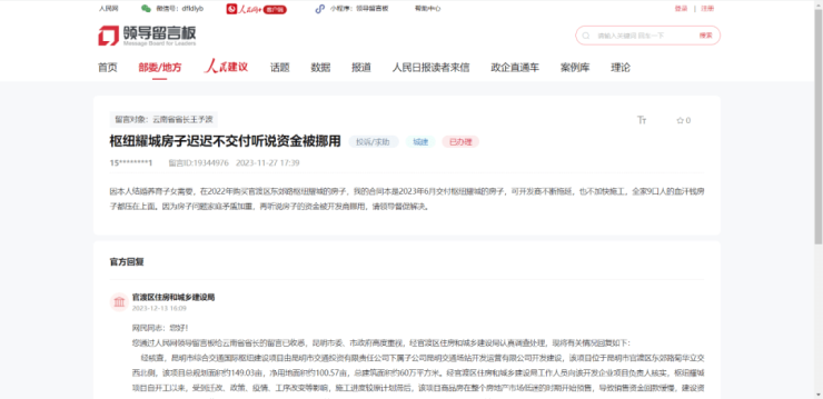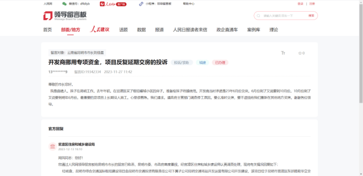 今年以来,有多名网友通过人民网地方领导留言板反映称:昆明的枢纽曜城项目原定于2023年6月交付,但开发商不断拖延,也不加快施工速度,项目交付时间反复延期。还有网友反映“项目长期没人施工”。