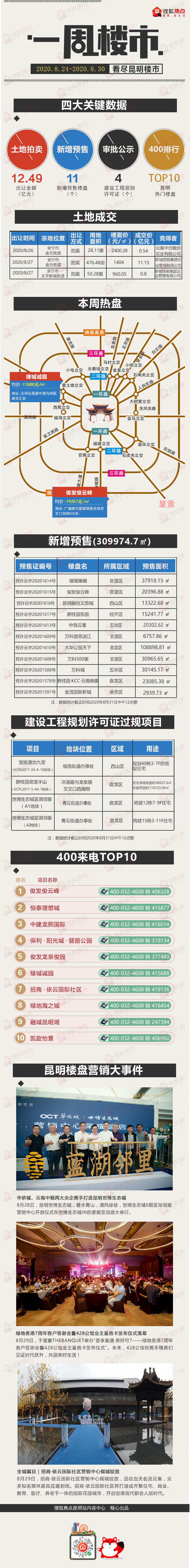 上周(8月24日-8月30日),昆明楼市共11个项目发放11张预售证,新增309974.7㎡预售面积;太平新城8宗土地出让,出让金额12.49亿元,俊发俊云峰成为400来电较高的楼盘。
