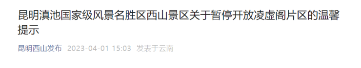 4月1日,昆明西山风景区发布公告,由于西山景区凌虚阁片区的游客骤增,超出该点位最大承载量,存在一定安全隐患,为确保游客人身安全,即日起暂停开放凌虚阁片区。