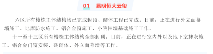 此外,世贸璀璨世家(新闻回看→昆明这个项目复工有新进展!相关部门还提到了纾困资金......)、人民路1979等项目都已复工。人民路1979、实地花鹤翎等项目已在相关政府部门的研究部署下将项目资金监管列为一级监管。