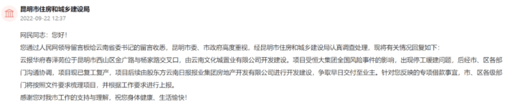 9月22日,昆明市住房和城乡建设局回复:云报华府春泽苑由云南文化城置业有限公司开发建设。项目受恒大集团全国风险事件的影响,出现停工缓建问题,后经市、区各部门沟通协调,项目现已复工复产,项目后续由股东方云南日报报业集团房地产开发有限公司进行开发建设,争取早日交付至业主。