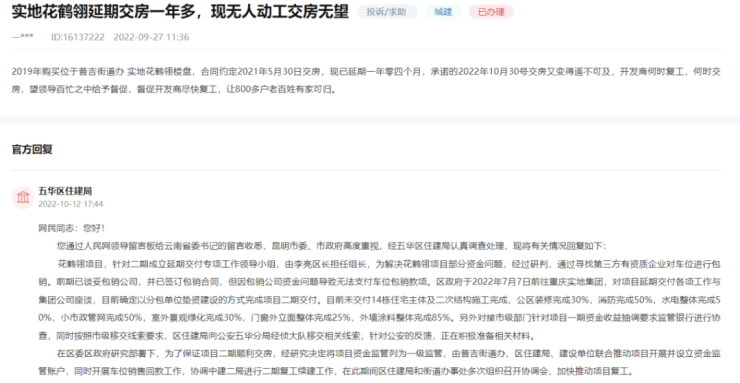 10月12日,盘龙区住建局回复,该项目已于2022年10月5日全面复工,项目剩余工程量为室外绿化及室内厨卫具安装,目前项目资金已到位,并由政府介入监管,预计2—3个月完成交付。