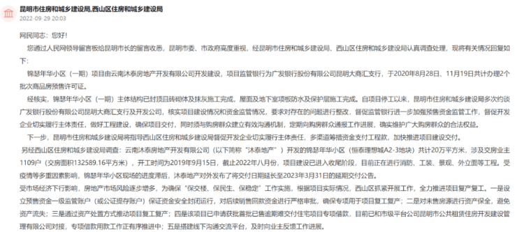 9月29日,昆明市住房和城乡建设局,西山区住房和城乡建设局的回复中提到以下几个重要信息:锦瑟年华小区(一期)项目由云南沐泰房地产开发有限公司开发建设,项目监管银行为广发银行股份有限公司昆明大商汇支行,于2020年8月28日、11月19日共计办理2个批次商品房预售许可证。