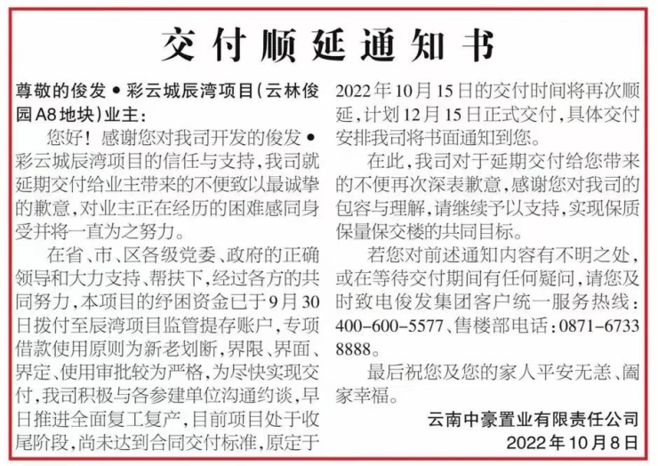 10月8日,俊发·彩云城辰湾项目公司云南中豪置业有限责任公司发出延期交付通知。通知显示,在省、市、区各级党委、政府的正确领导和大力支持、帮扶下,经过各方的共同努力,项目的纾困资金已于9月30日拨付至辰湾项目监管提存账户。