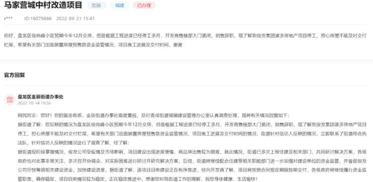 10月14日,盘龙区金辰街道办事处回复:据街道现阶段掌握情况,俊发公司受疫情及市场影响,项目建设出现进度缓慢、商品房出售较为艰难,就此情况,街道已多次上报住建及相关部门,共同研讨解决方案,各级政府也对此事非常关注,多次召开协调会,对实际困难进行研讨并研究解决方案,后续,街道将继续配合住建等相关职能部门进一步加强对建设单位的资金监管,并督促俊发公司尽快筹措相关建设资金,加快建设进度,据街道了解,该项目目前建设正在有序推进,经向开发商了解,项目将按照合同规定期限按期交付,项目目前情况较为稳定,正在稳定推进中。
