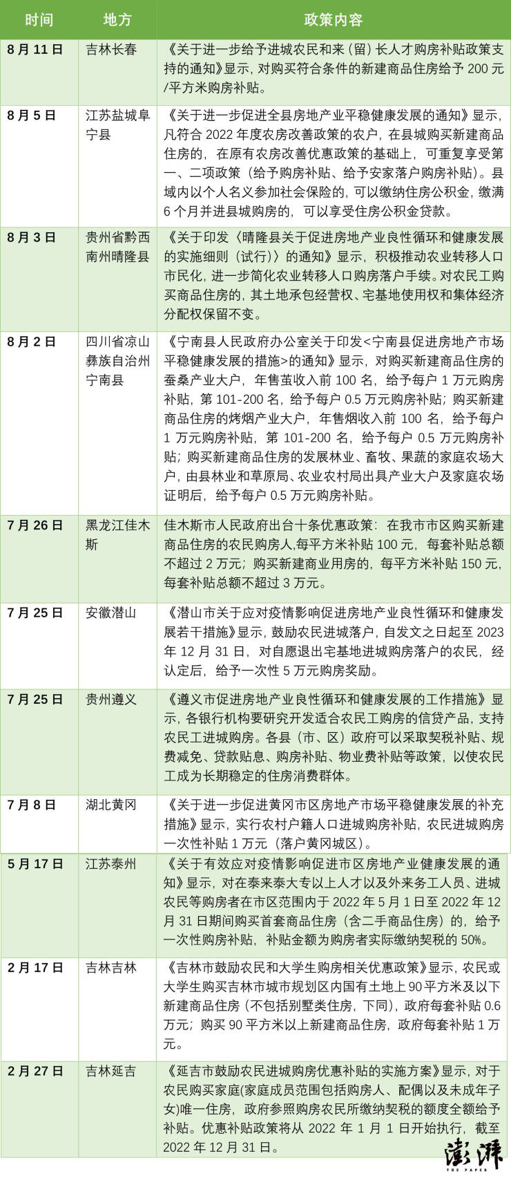 据澎湃新闻不完全统计,今年以来,至少包括吉林省延吉、吉林省吉林、江苏省泰州、湖北省黄冈、贵州省遵义、安徽省潜山、黑龙江省佳木斯、吉林省长春等城市以及四川省凉山彝族自治州宁南县、贵州省黔西南州晴隆县、江苏盐城阜宁县等地出台鼓励农民进城购房的相关政策。