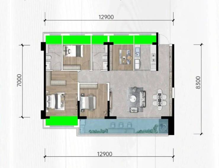 3、将景观阳台一分为二,客厅一侧全屋通铺,打破墙壁和格局的限制,把空间最大化利用,通风采光也做到最大化;次卧一侧作为生活阳台使用,这样一来实用性更强,但一定程度上可能影响次卧居住体验感;