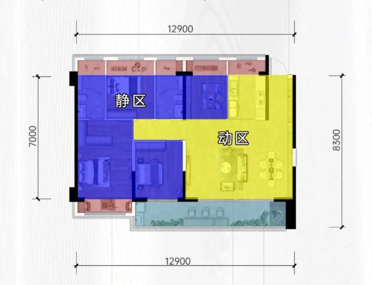 该户型是基本上是动静分区的格局,娱乐休息互不打扰;卫生间可以根据自身需求在装修时选择是否干湿分离。