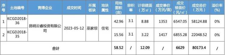 2023年5月12日,官渡区巫家坝片区2宗优质住宅用地成交,为东航投资公司旗下昆明云睿投资有限公司底价获取。