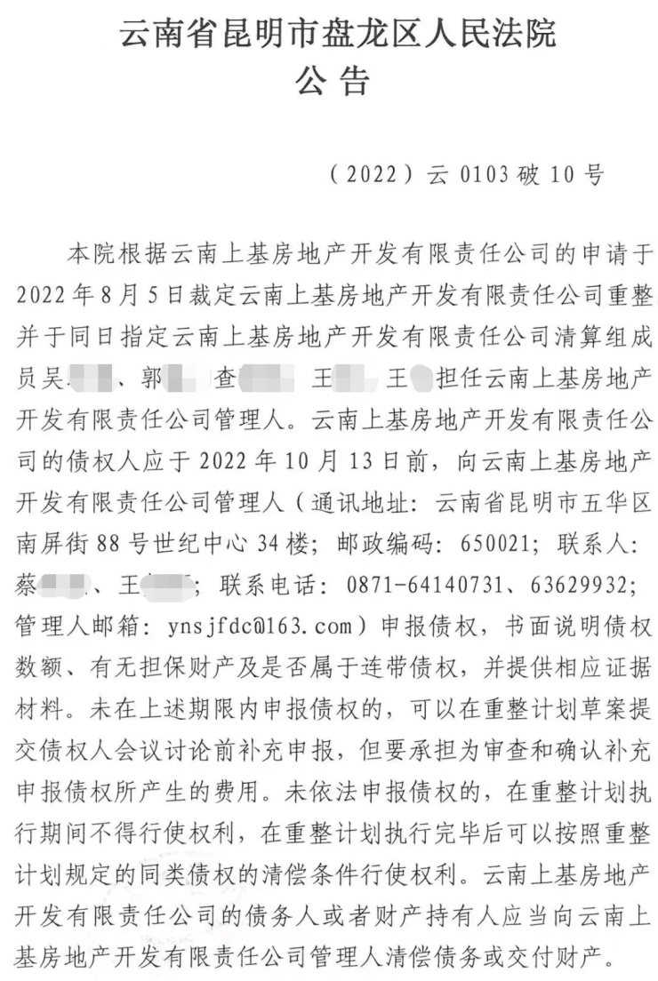 公告显示,8月5日,盘龙区法院裁定受理了上基地产重整一案,并于同日指定上基地产清算组的5人担任管理人。公告提示,债权人申报债权需要书面说明债权数额、有无担保财产及是否属于连带债权,并提供相应证据材料。公告提到,购买、租赁云南上基地产“昆明玉器城”项目商品房的买受人、承租人等物业权益人涉及人数较多,管理人在“昆明玉器城”项目位置开设现场咨询点,上述人员可前往现场咨询。