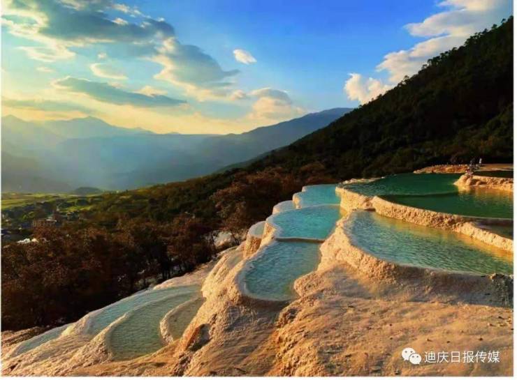 白水台位于哈巴雪山山麓,香格里拉市城东南的三坝乡白地村,距城区101公里,海拔2380米。它是由于碳酸钙溶解于泉水中而形成的自然奇观。含碳酸钙的泉水慢慢下流,碳酸钙逐渐沉淀,长年累月就形成台幔,好似层层梯田,被称为“仙人遗田”,面积约3平方公里,是我国较大的华泉台地。