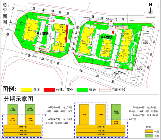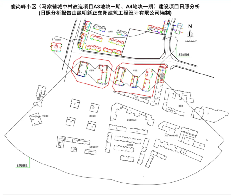 俊尚峰小区(马家营城中村改造项目A3、A4地块)《建设工程规划许可证》批前公示已于2021年3月5日至3月15日期间进行,由于公示其间因日照遮挡问题收集到大量意见建议,目前尚未完全处理完成,现建设单位申请对俊尚峰小区(马家营城中村改造项目A3、A4地块)低层区域日照分析主、客体范围满足规范规定的范围先行办理《建设工程规划许可证》,待妥善处理高层区域日照问题后,再行申报俊尚峰小区(马家营城中村改造项目A3、A4地块)高层区域《建设工程规划许可证》,分期方案具体如下: