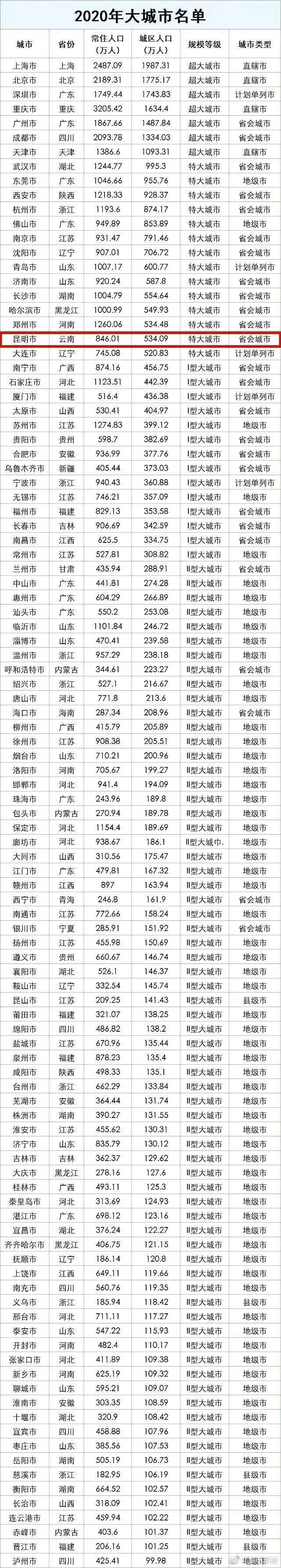 具体来看,作为云南省省会城市的昆明,是云南少有上榜的城市,为特大城市,有常住人口846.01万人,城区人口534.09万人。