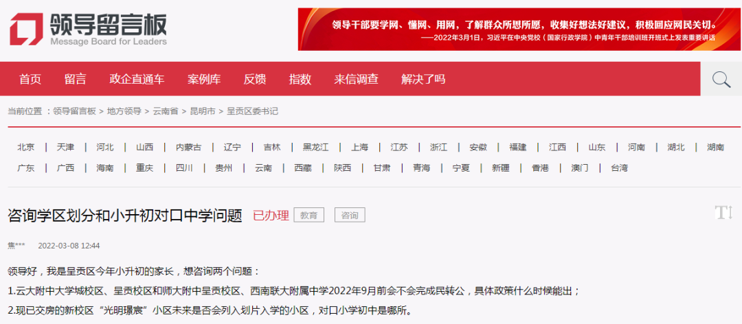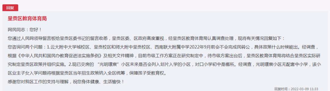 近日,有网友通过地方领导留言板,咨询呈贡区的学区划分和小升初对口中学问题。