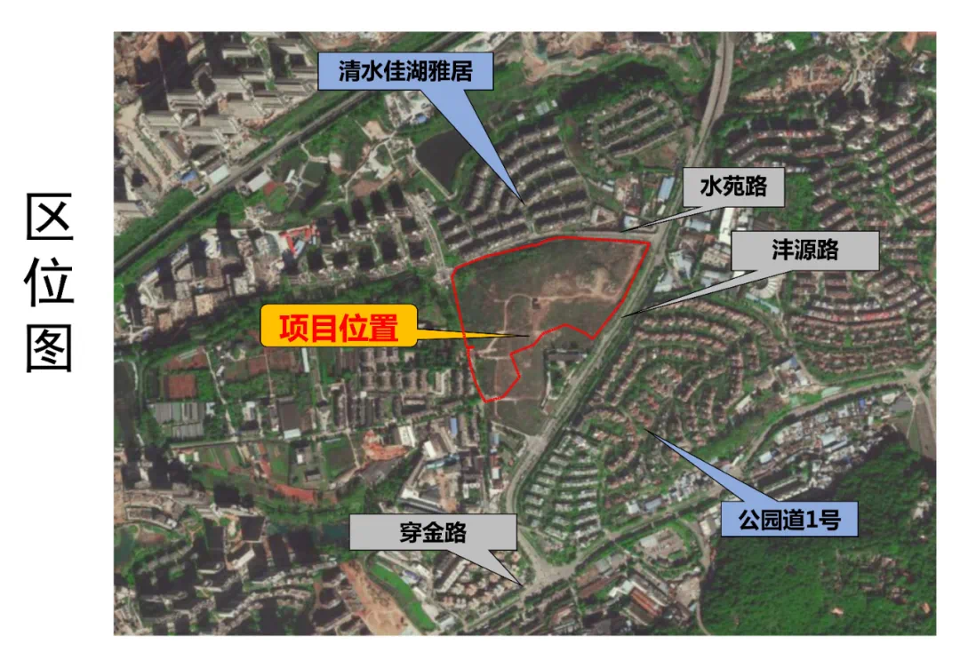 该地块处于昆明北市区水苑路与沣源路交叉口附近,地块临近清水佳湖雅居、公园道1号、凤鸣苑生态住宅等社区毗邻昆明市金殿中学且临近昆明金殿国家森林公园,生态资源优势显著,周边有杭瑞高速、沣源路、穿金路等主干道环绕,距离地铁2号线北部汽车站也不远,交通通达性较好。