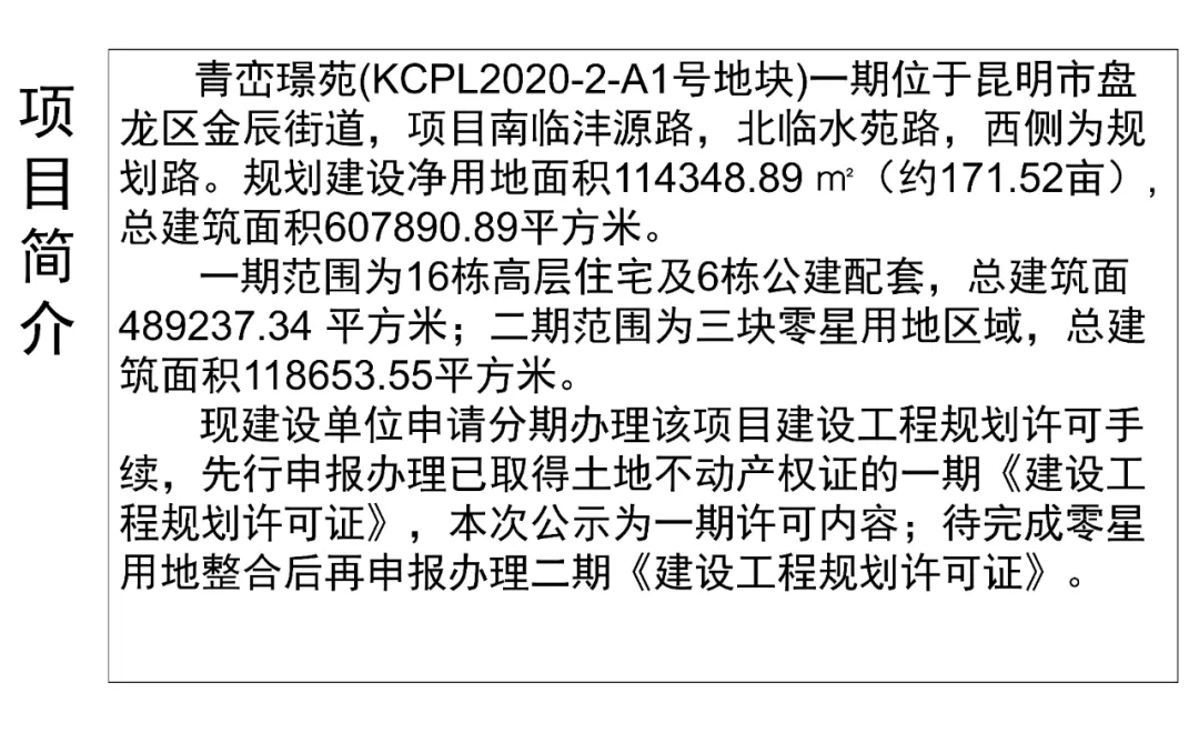 6月3日,昆明市自然资源和规划局发布了《青峦璟苑(KCPL2020-2-A1号地块)一期项目建设工程规划许可批前公示》。项目一期规划16栋高层1栋幼儿园。