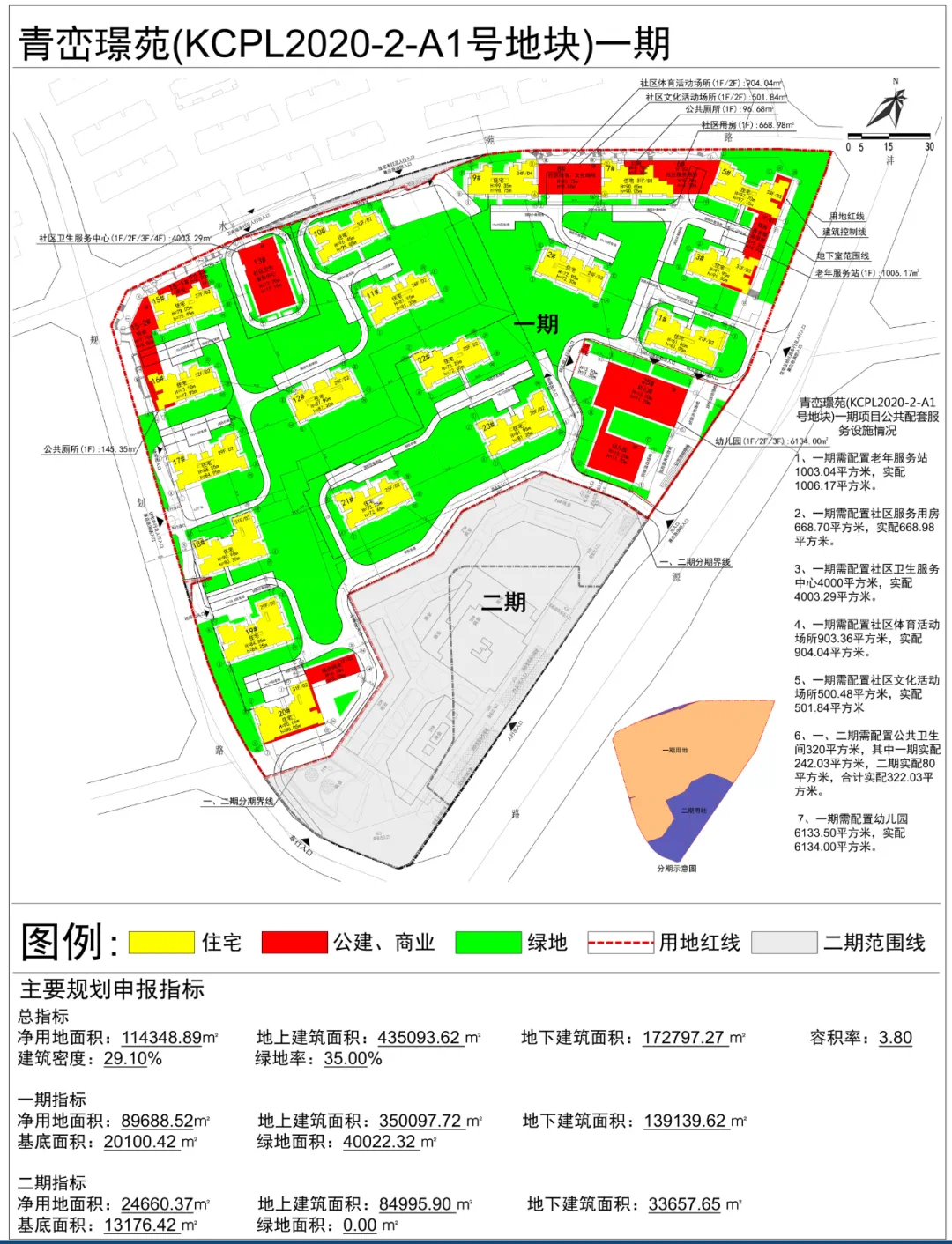 一期范围为16栋高层住宅及6栋公建配套,总建筑面48923734平方米;二期范围为三块零星用地区域,总建筑面积118653.55平方米。