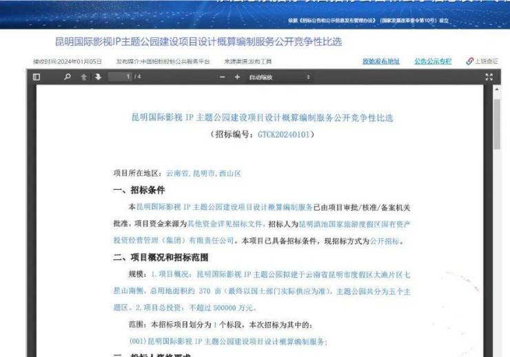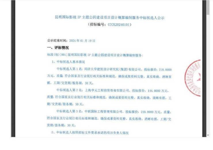 1月16日,中国招标投标公共服务平台发布《昆明国际影视IP主题公园建设项目设计概算编制服务中标候选人公示》。