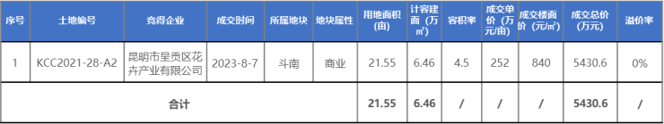 本月主城区1宗土地成交,为呈贡区斗南片区1宗21.55亩商业用地,总计容面积6.46万㎡,起始价0.54亿元;被昆明市呈贡区花卉产业有限公司底价获取,拟建设斗南国际花卉综合物流中心项目。