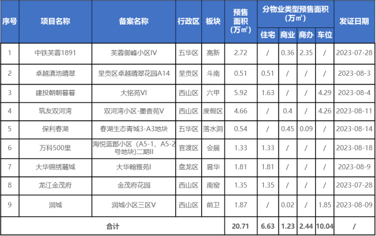 8月主城新增预售20.71万方,其中住宅6.63万方;另青年说云悦项目取得现售证,总建面3.48万方,全部为住宅。新增预售住宅主要为建投朝朝暮暮、万科500里、大华锦绣麓城、龙江金茂府和卓越滇池晴翠项目。成交上受新项目增多和暑期影响,成交量环比稳定,价格剔除特殊备案略有上涨。